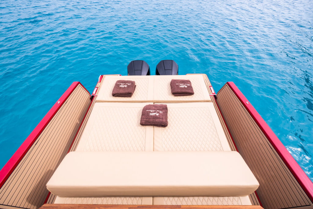 Het buitendek van de Nuva M11 Open nodigt uit tot ontspanning en samenzijn, met een ruime rondzit, zonnebedset en een complete buitenkeuken. De perfecte setting voor een dag vol plezier, zon en onvergetelijke momenten.